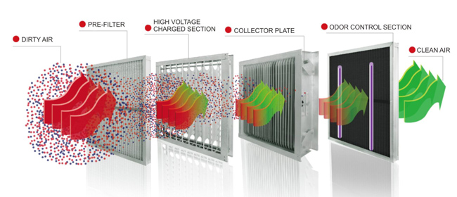 Electronic Air Cleaner removes airborne particles by electrostatic prdcipitation. Dirty air is drawn by a fan through an aluminium alloy mesh washable tre-fillter or other media fillters shich trap large size particles. The remaining particles enter the high voltage charged section collecting section of cell consisting of parallel arrays of positive and negative clectrode plates.The positive plate repels the positively charged particles.The negative or grounded plate attracts them.Partcles,some as small as 0.01 microns are collected on the negative plate. UVC sterilization and odor control section are optional.