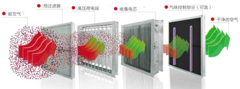电子空气净化机利用静电沉淀原理去除空气中的颗粒物。肮脏的空气在风机的牵引下首先通过铝合金网或其它介质过滤大粒径颗粒物,剩余的颗粒物进入一个两段式高压静电场,第一段为高压荷电段,让颗粒物带上正电荷,同时使电场中附着在颗粒物上的细菌表皮被电击穿坏死;带电荷的颗粒物进入由正负电极板组成的阵列式强电场(收集电芯),正电极板排斥带正电荷颗粒物......